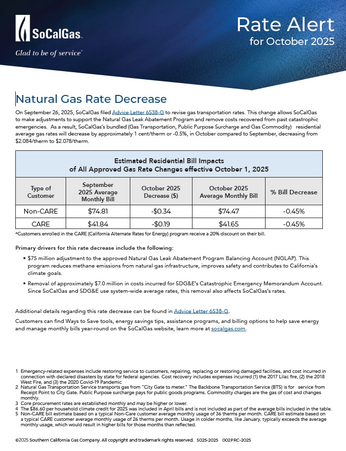 2025 Rate Alerts SoCalGas Natural Gas Rate Alert: January 2025 Download PDF SoCalGas Natural Gas Rate Alert: February 2025 Download PDF SoCalGas Natural Gas Rate Alert: July 2025 Download PDF SoCalGas Natural Gas Rate Alert: September 2025 Download PDF SoCalGas Natural Gas Rate Alert: October 2025 Download PDF 2024 Rate Alerts SoCalGas Natural Gas Rate Alert: January 2024 Download PDF SoCalGas Natural Gas Rate Alert: July 2024 Download PDF